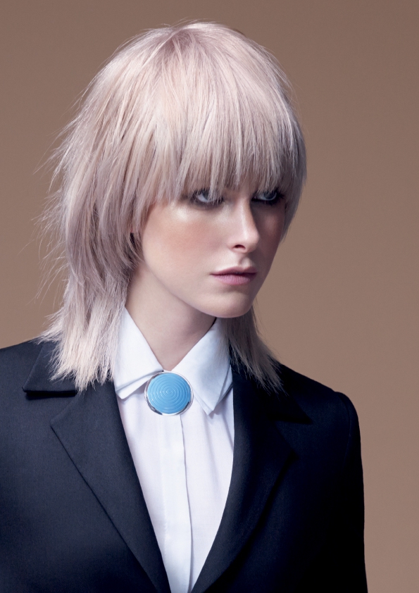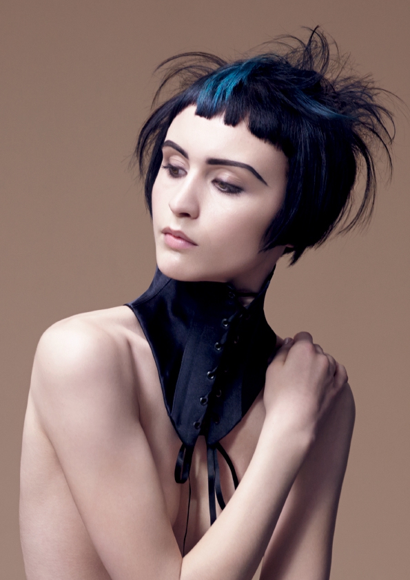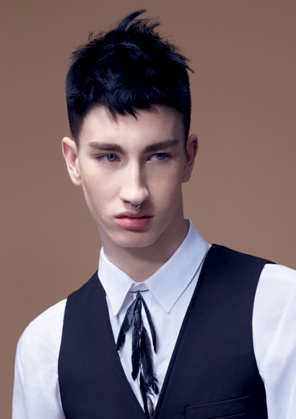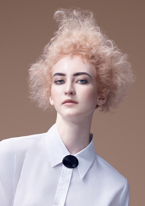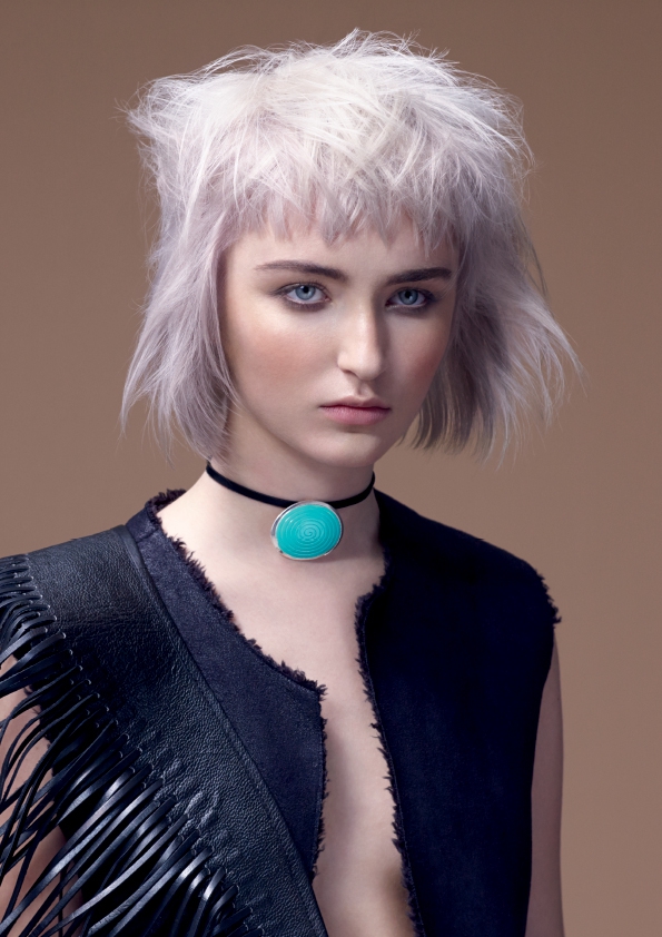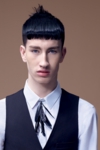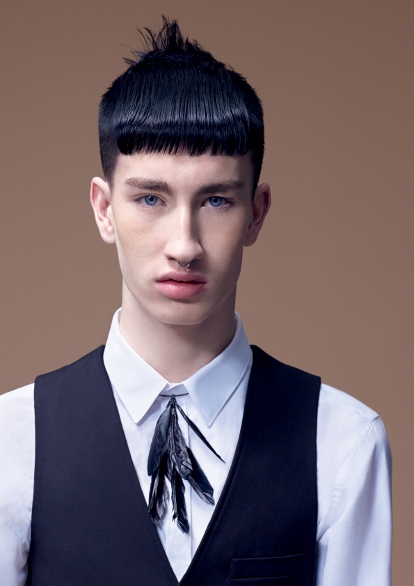ジオメトリックな輪郭はギザギザなセクショニングと、整髪されたフェードにより遮られます。重なり乱れたレングスは極端なオーバーダイレクションと結びつき、嵐の吹き荒れるような感覚のタフなテクスチャーを創り上げます。クリアなデザインは示唆されると同時に破壊され、エッジは大雑把に不明瞭なものとなります。