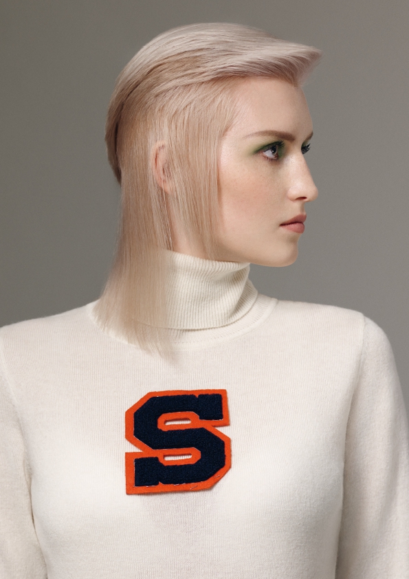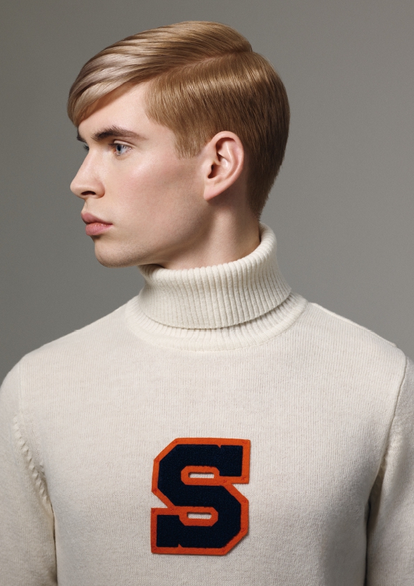 IVY LEAGUE(アイビーリーグ):ケネディースタイルをスリム化したクリーンカットは、おおざっぱな分け目によって強調された、パリパリのホワイトリネンブロンドの下地に施されたクラシックなバーバリングテクニックにインスパイアされたものです。