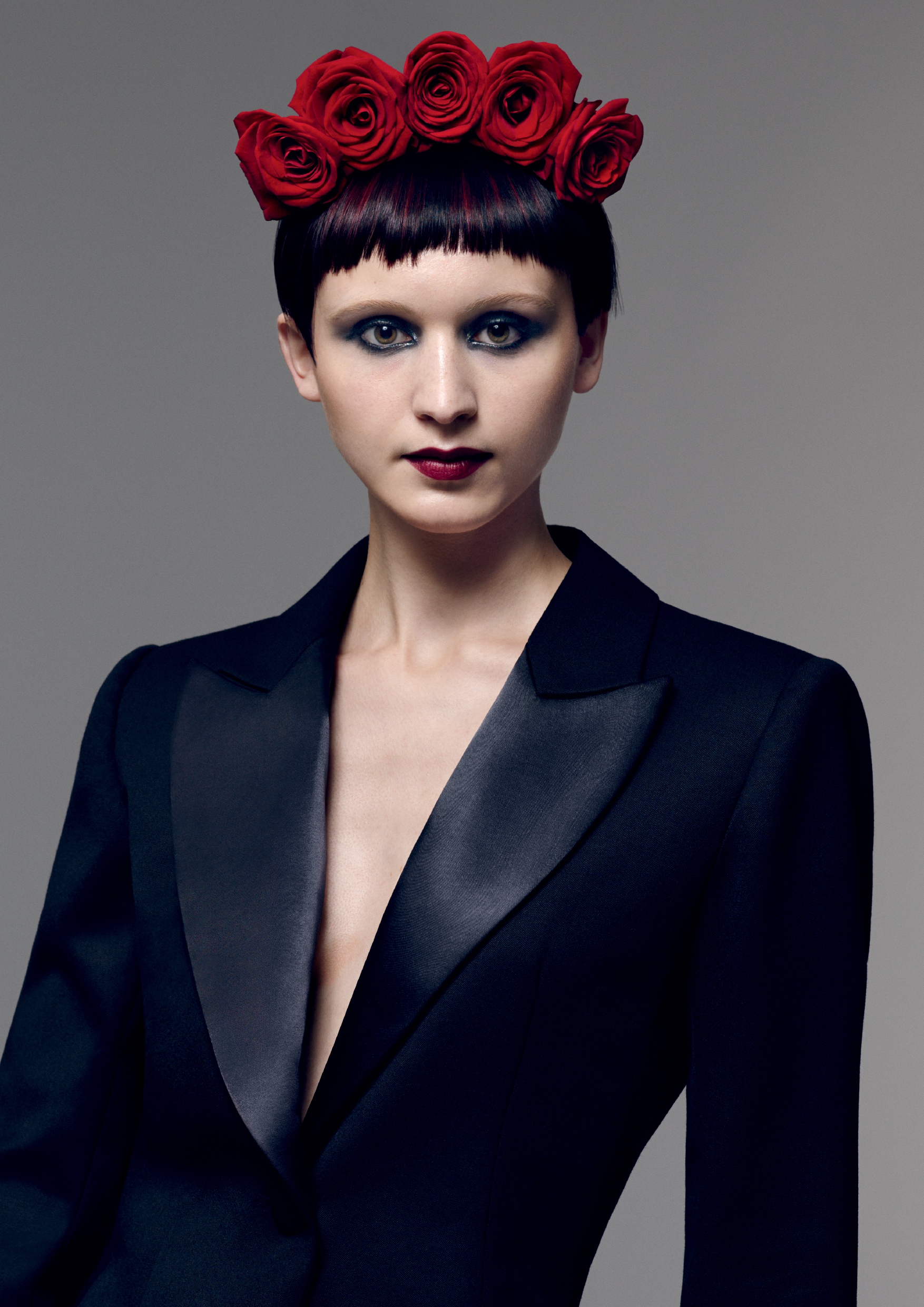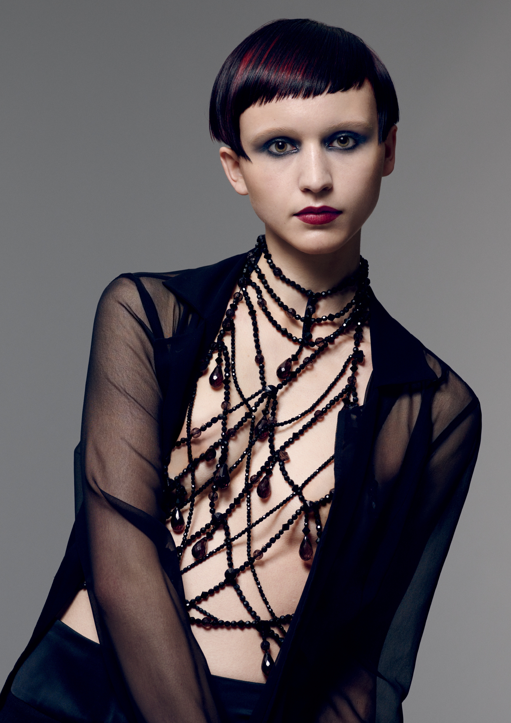 妖しげなランジェリーは二重にエッジされたフリンジと、頭部を覆う釣鐘帽子のシルエットによって複雑に切り離されたヘアーラインを基にしたルックスにインスパイアされたものです。コールブラックとクールなブルーとレッドのトーンが頭部全体で混じり合い、溶け合い、層を形作ります。
