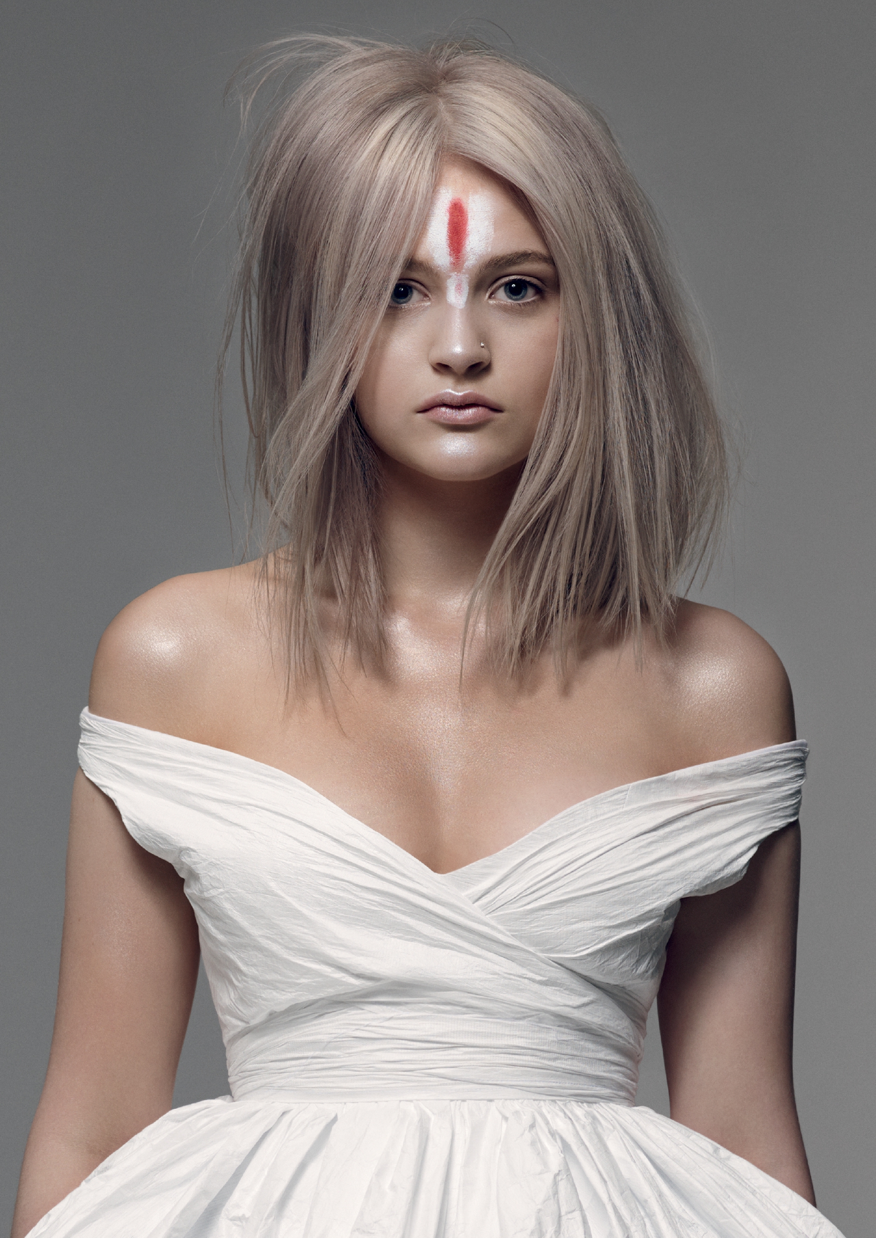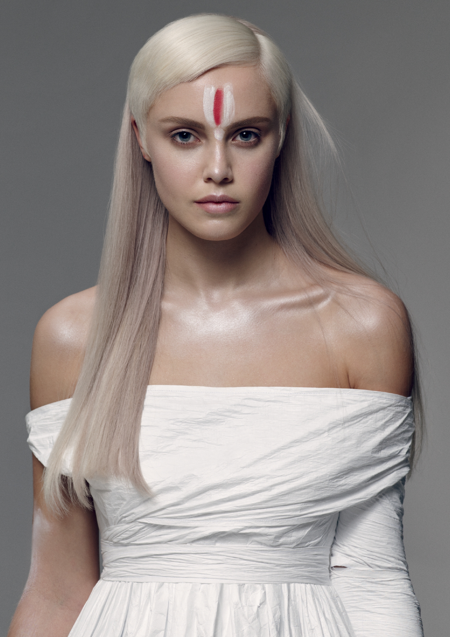 された白に白を重ねるテクニックと、ロングヘアーに施されたリズミカルにジグザグなセクショニングは、ルーズで空気感のあるフィーリングを生み出します。