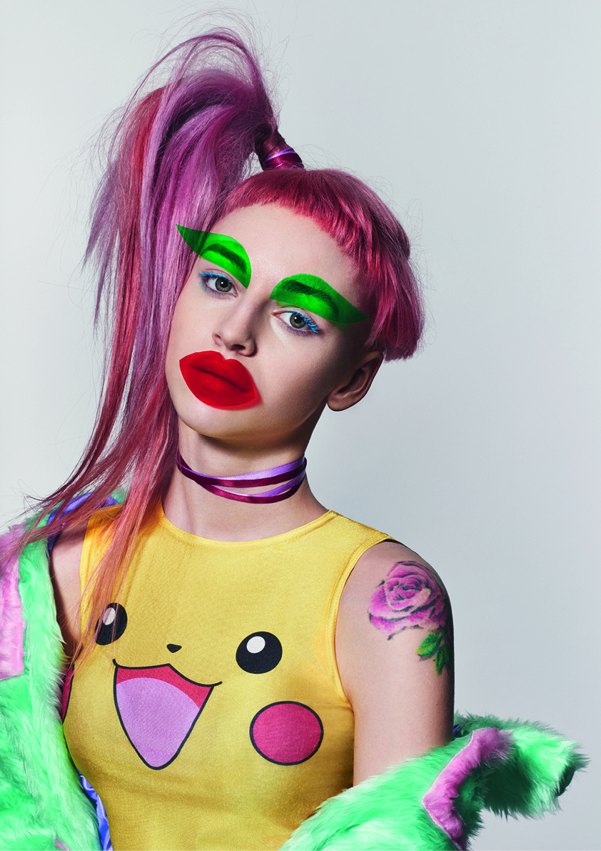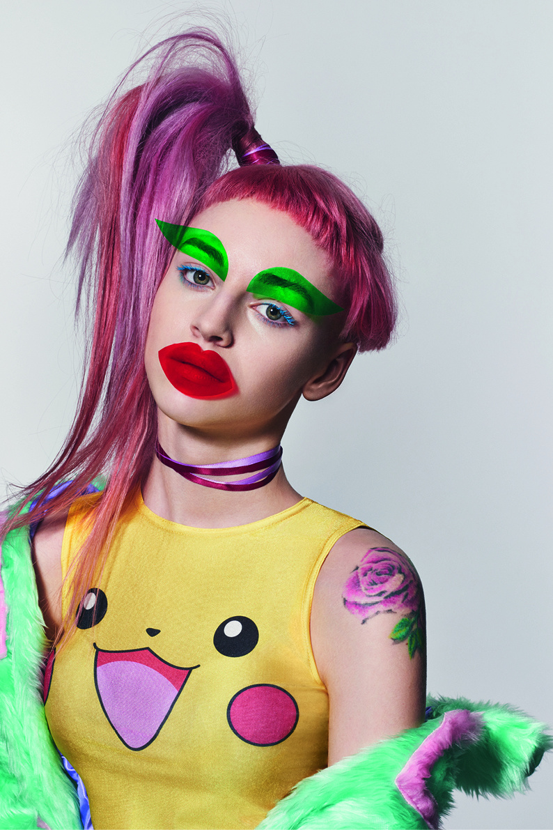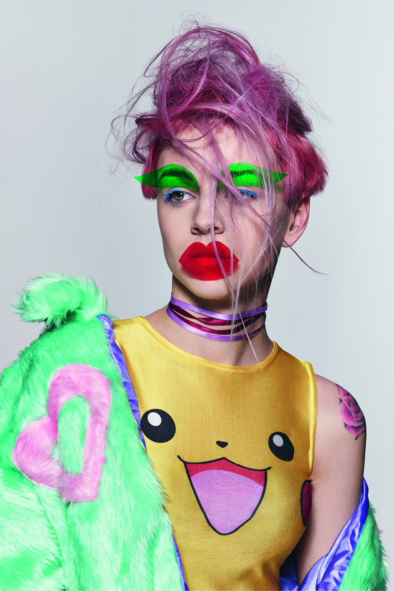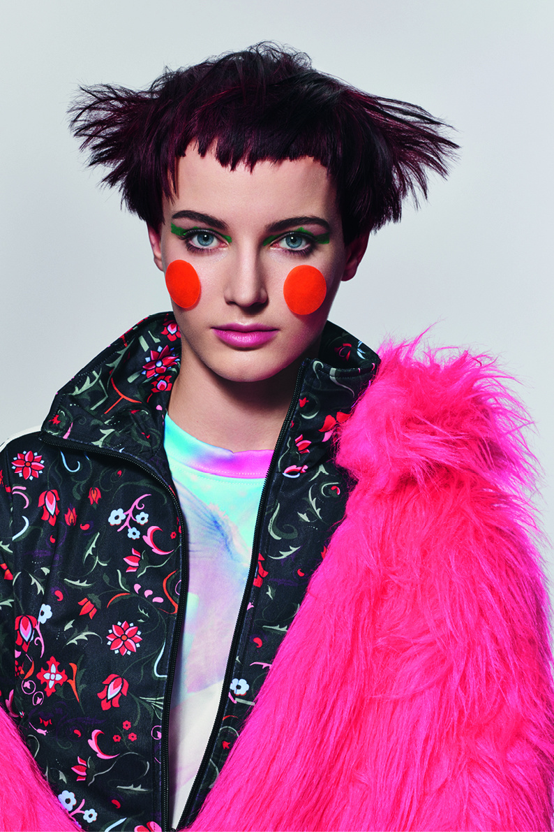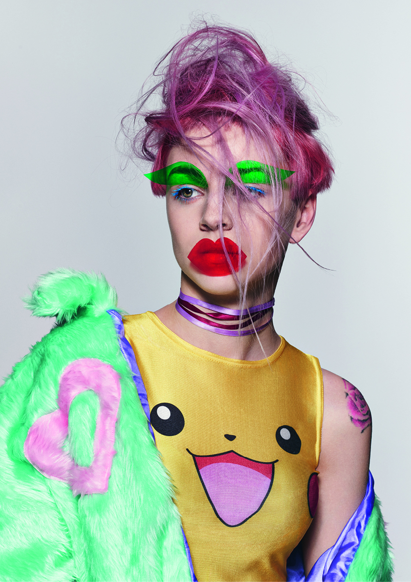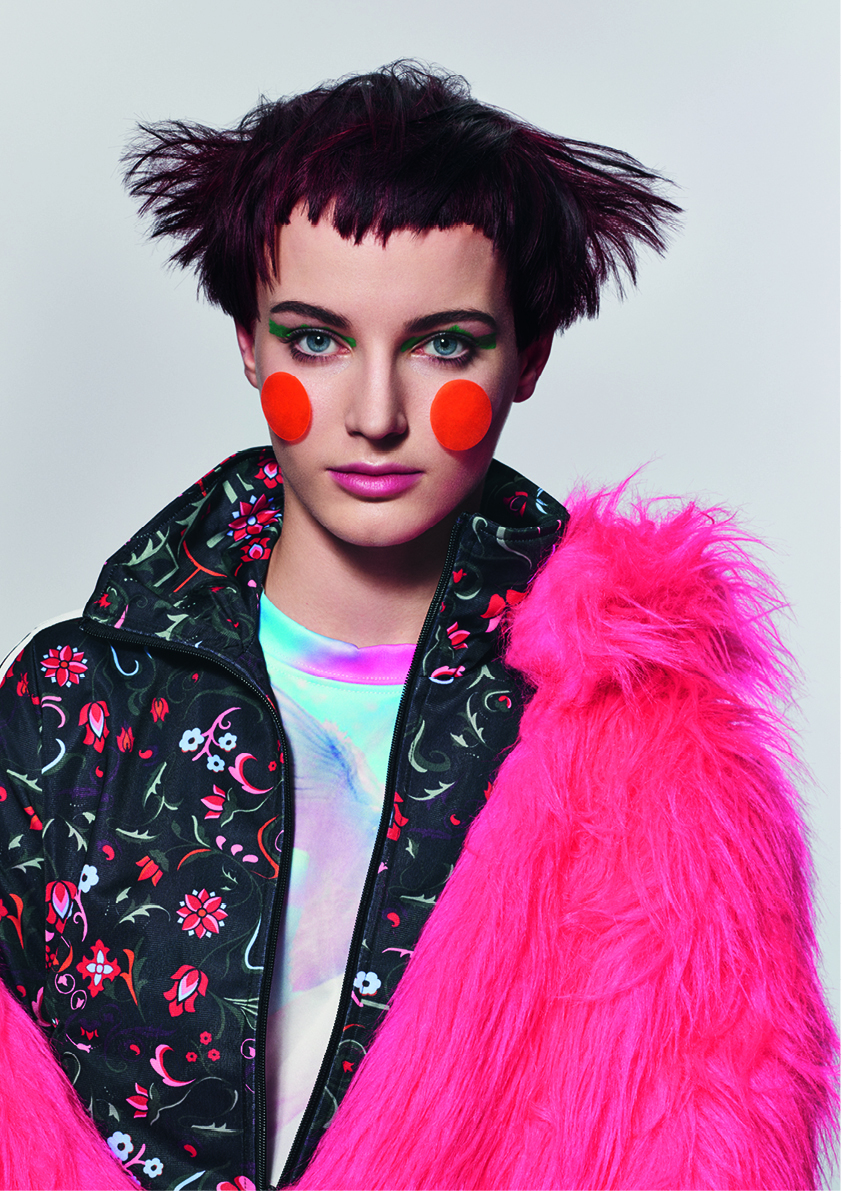 キャンディースウィートなポップスターや韓国のK-POPアイドルグループは、そのバブルガムミュージックと叩き込まれた振付け、華やかなイメージ構築、蛍光色のファッションで市場を席巻しました。サスーンはK-POPをひとつまみ取り上げ、それを80年代のゲームセンターのテトリスとミックスしています。その結果、幻のような先細のシェイプとエルテ(アール・デコの画家)スタイルのフリンジ、そしてシクラメン、バイオレットとモーブが無秩序に混ざった色とのコンビネーションが生まれました。