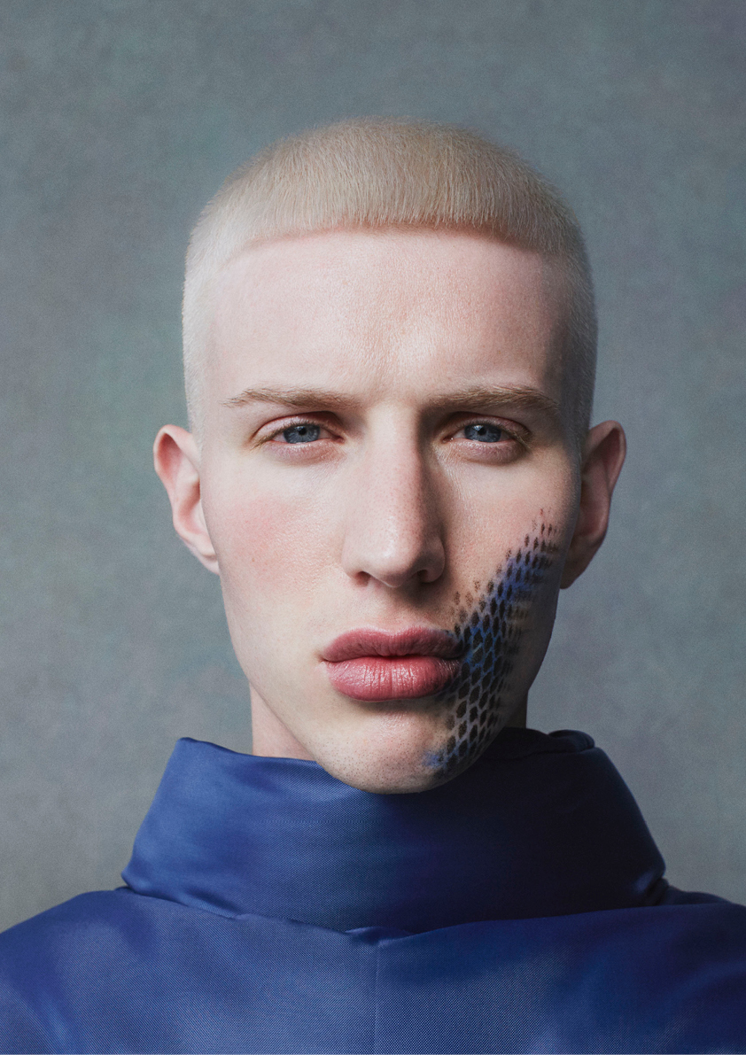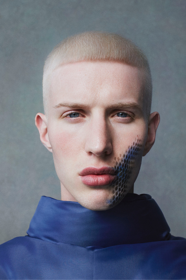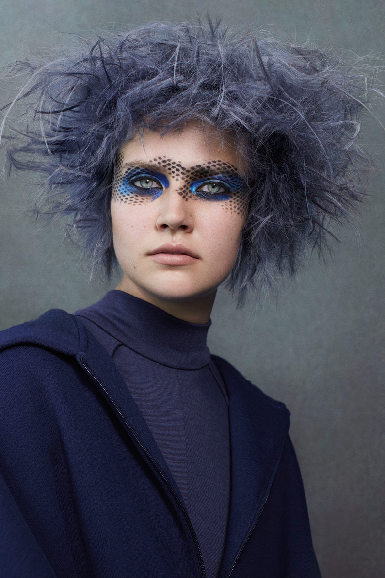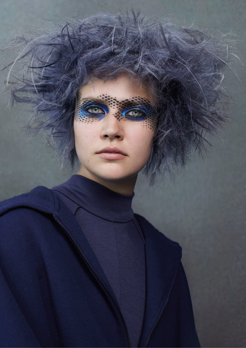 サスーンのカラーパレットよりコンクリートグレー、カーボンブルー、ブリックレッド、クレイブランをあしらい、大きすぎるスポーツウェアやPUFFAのジャケットを身に着ける事で、あたかも都会におけるカモフラージュのようなスタイルになっています。広範囲にスタイルの中に現れるカラーは顔を覆うベールと共に色味の分散を作り出しています。