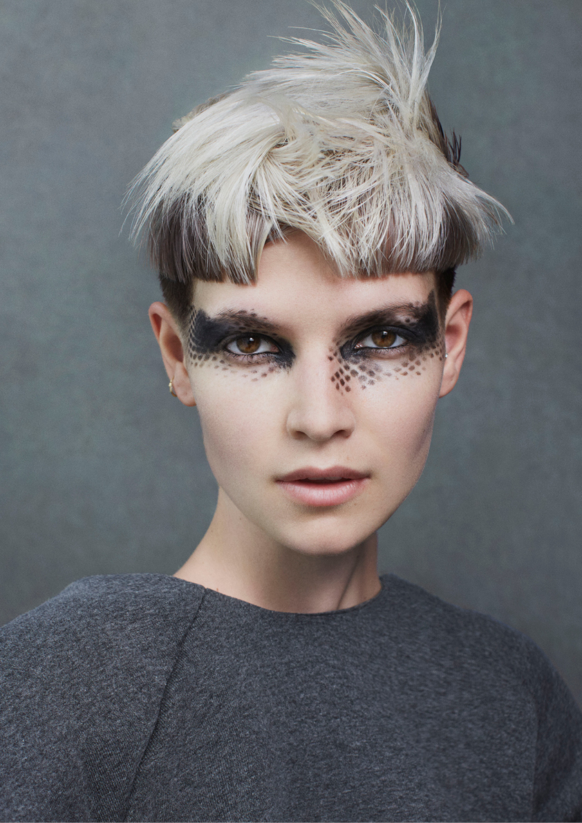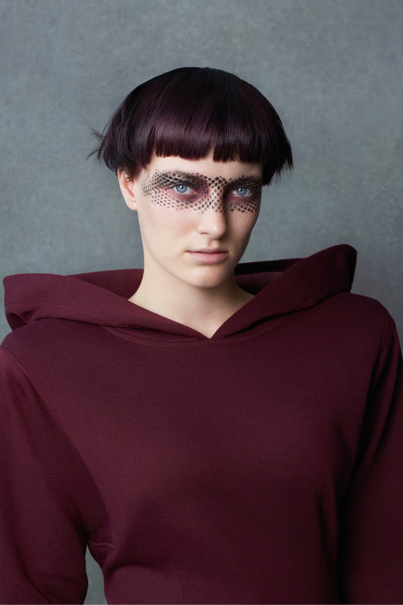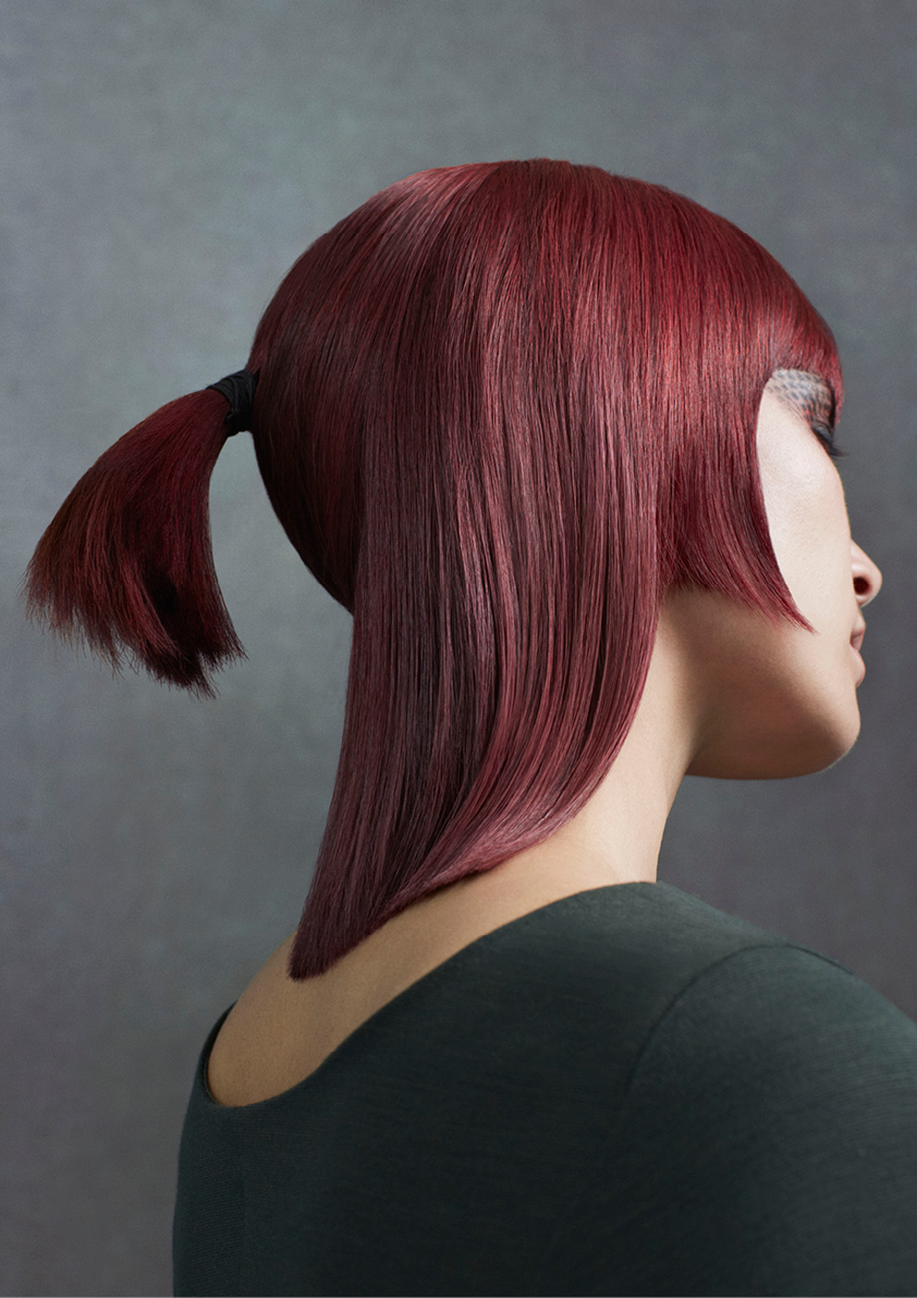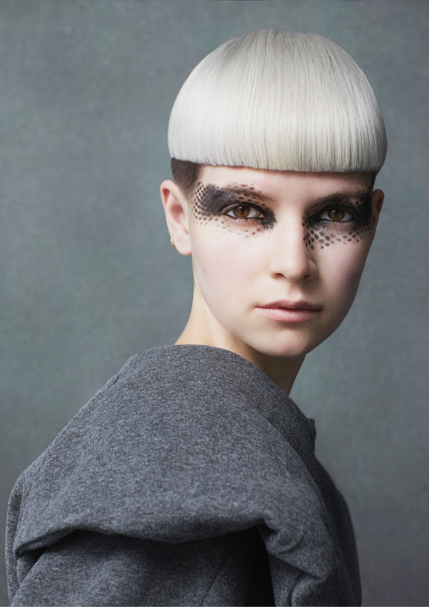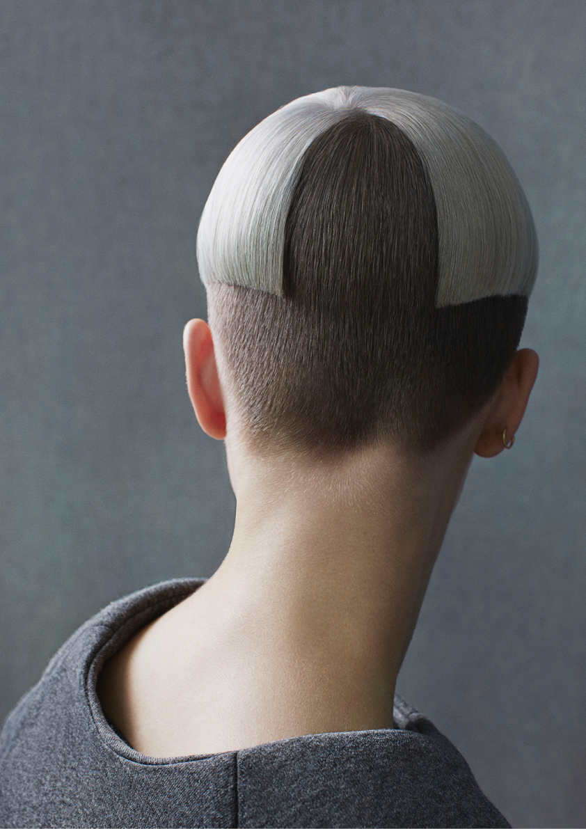 複数のカット技術と身に着ける要素は後世に受け継がれるサスーンのエディトリアルスタイルに敬意を表しています。往年のプディングボウルや、ロジャー・トンプソン氏のmifumiからインスピレーションを得たシニョンやポニーテール、ヴィダルの作った革新的なスクエアカール。広範囲に作業するエリアはポインティングやスライシングを使わず、ありのままのセクショニングは新しいヘアメイクの土台になっています。